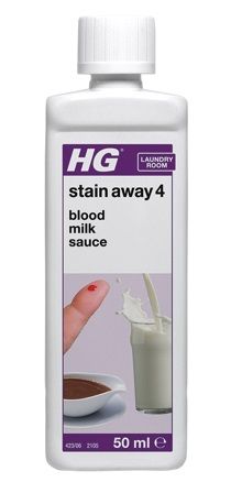 HG stain away no. 4- removes stains caused by sauce, gravy, herbs, blood, milk and egg whites, but also chocolate, mayonnaise, whipping cream and exudate. HG stain away no. 4 is one of our 7 special HG stain removal products.
