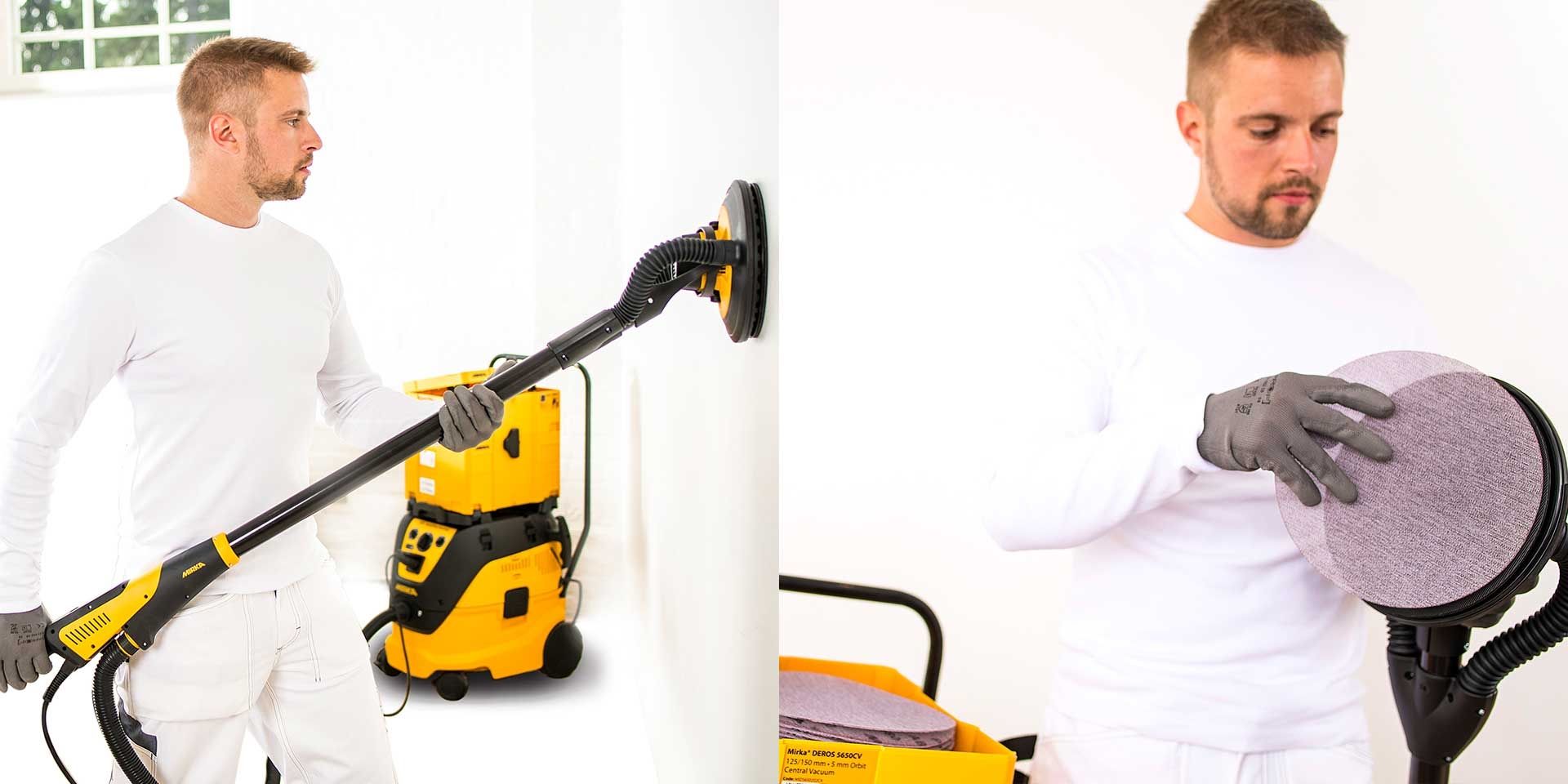 Mirka Leros 950cv is the most advanced wall and ceiling orbit sander on the market, and weighing only 3.5kg it is also the lightest meaning less strain on the operators body. The dual suction points on the pad creates dust free sanding.