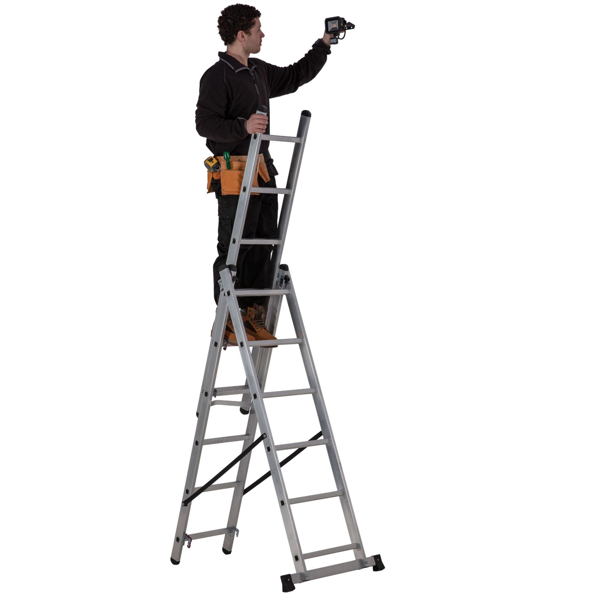 This 4 in 1 combination ladder is a versatile, multi-functional model with 4 positional modes in 1 ladder. The 4 in 1 also converts to a freestanding extension mode - perfect for when work-at-height needs to be carried out around areas where there is no support to lean an extension ladder. This ladder features special adjustment capability to allow for secure use on stairs, a stabiliser bar, slip-resistant rungs for comfort and security and heavy duty feet for added stability and grip. Conforms to the new EN131 standard. For Professional Use.- Combines a stepladder, extension ladder, stairwell ladder and freestanding extension ladder all in one product